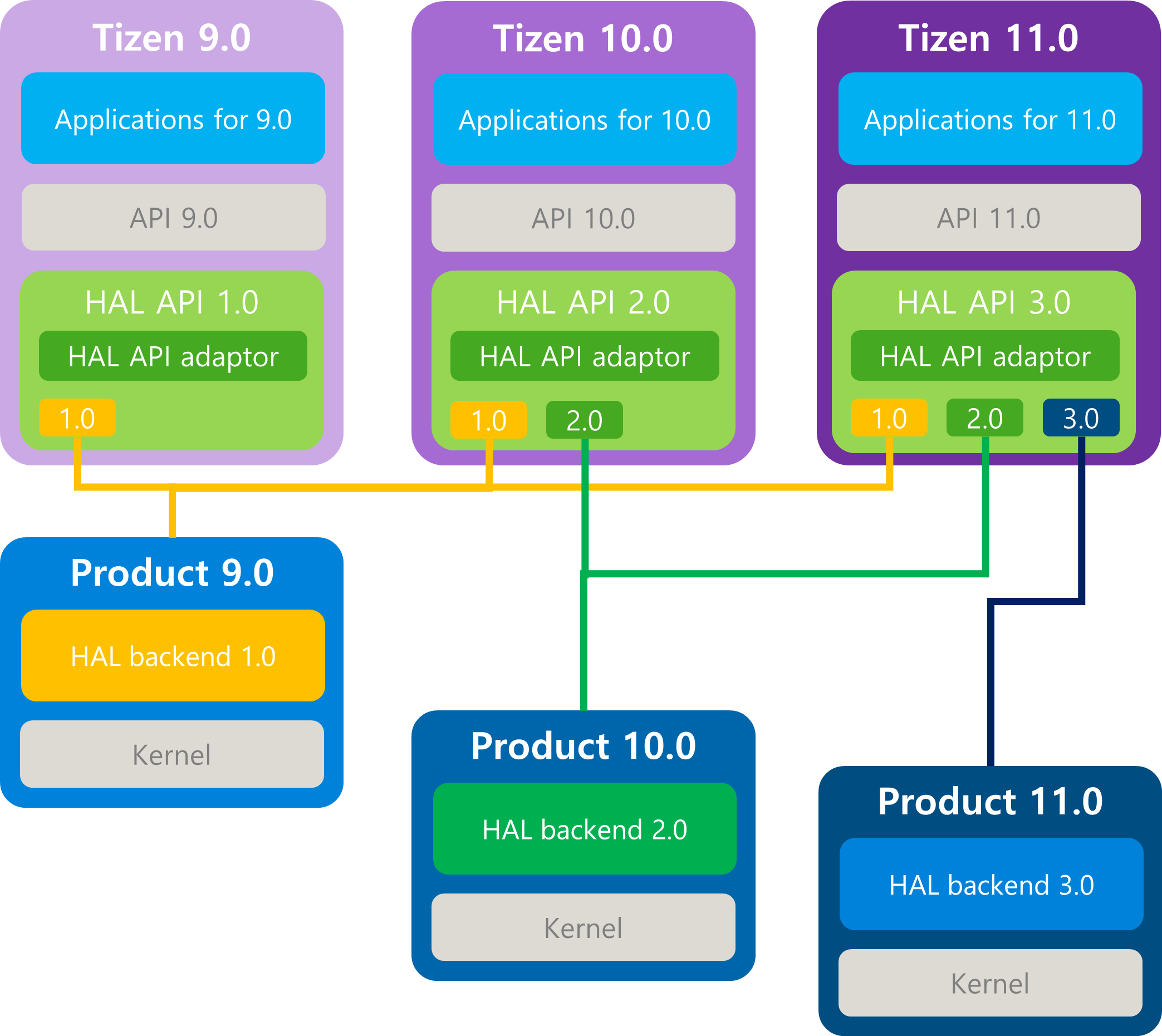 Tizen defined the HAL layer so that Platform / HAL can support complete separation and facilitate Tizen porting for new devices. The HAL layer is configured in the form of a HAL API package, and all Tizen Subsystems have implementations and interfaces defined in the HAL API common format.