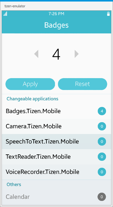 This sample application demonstrates how to manage badge counter of the application using Tizen.Applications and how to create circular UI using Tizen.Wearable.CircularUI. In addition, there is similar web sample application. |
