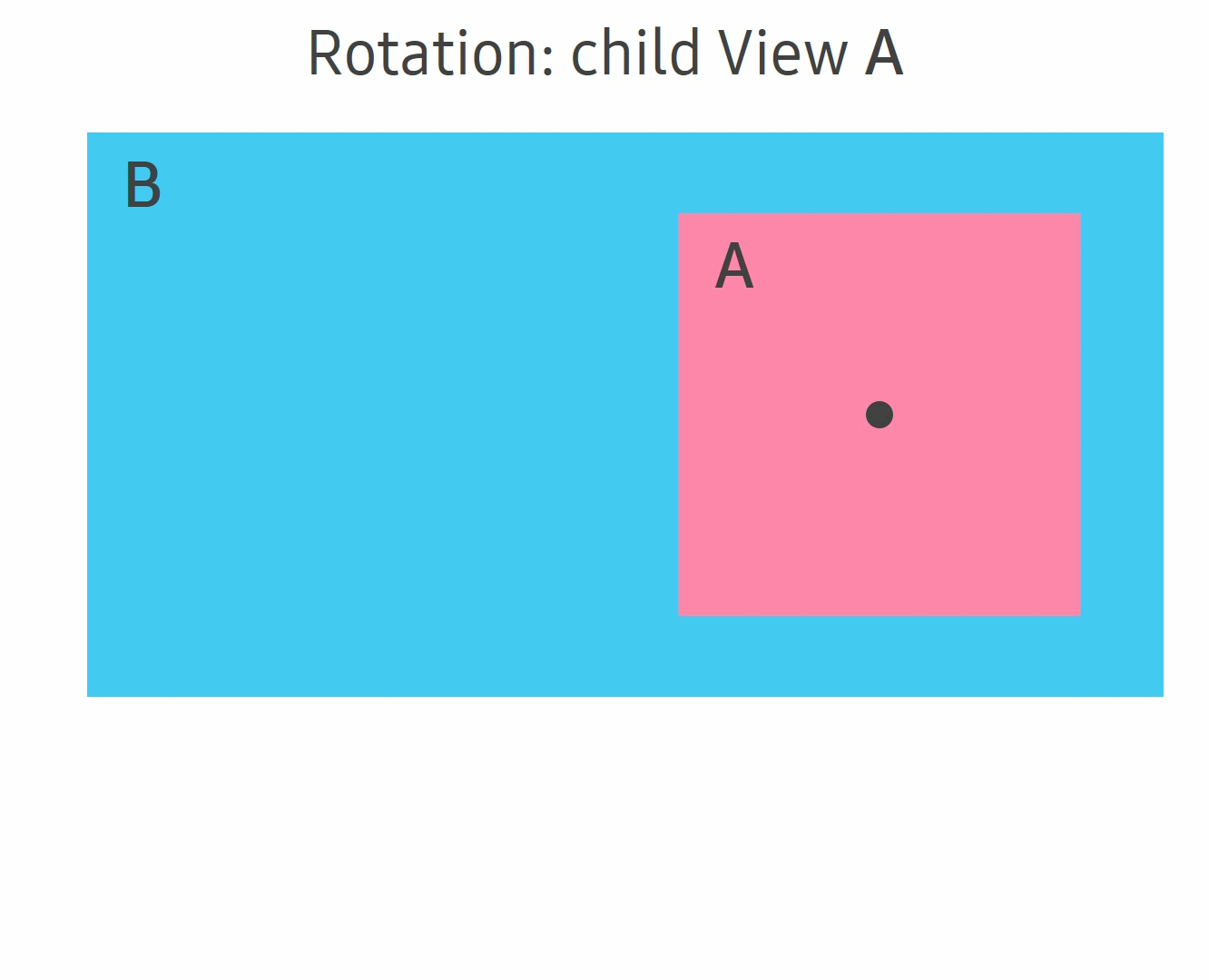 The following examples demonstrate the rotation and scaling that change Orientation and Scale respectively. View A is a child of View B. Therefore, transforms of A only affects A. However, the transforms of parent B influences its child A. The black dot in the figure is PivotPoint that is used by the transforms.