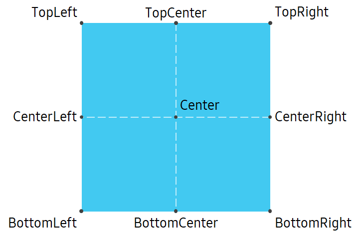 NUI provides predefined ParentOrigin as well as PivotPoint positions as shown in the following figure, and you can also use custom values for setting the position: