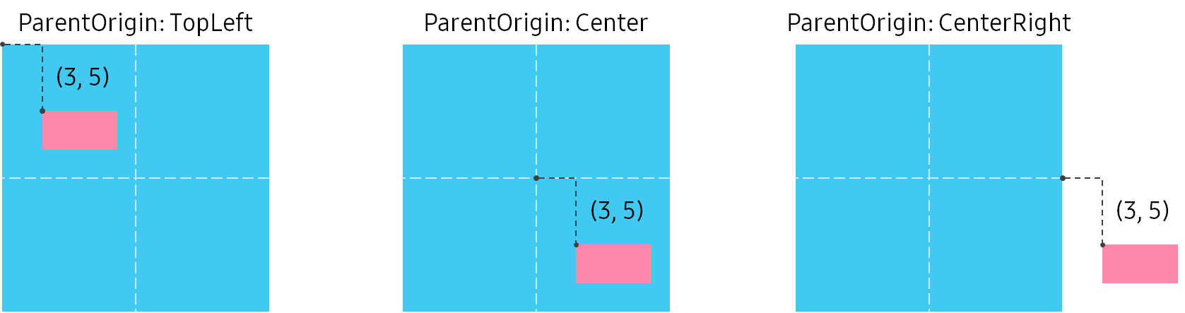 The following figure shows three cases of parent View and its child View. The parent View is represented by blue color and child View is represented by red color. In the following examples, all of the red-colored View coordinates are identically located at (3, 5) of its parent coordinate system, which is based on the ParentOrigin property of the child View. PivotPoint is set to default TopLeft: