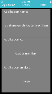 This sample application demonstrates how to get the specific information such as AppId, Package ID, and shared directory path. It also demonstrates how to get the directory information such as resource, cache, and app data and how to create circular UI using Tizen.Wearable.CircularUI. This application uses Tizen.Applications. In addition, there is similar native sample application. |