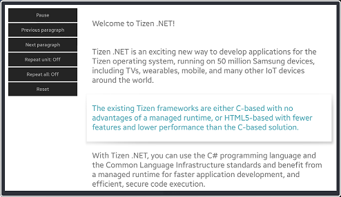 This sample application demonstrates how to synthesize voice from text using Tizen.Uix.Tts. |